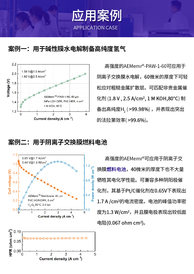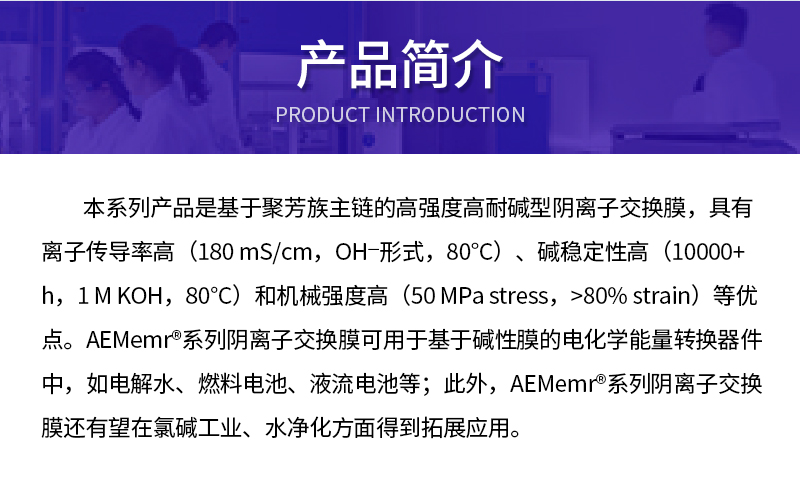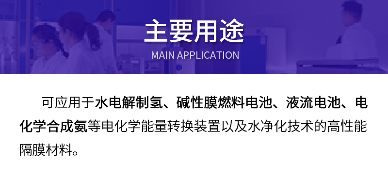 主要用途:水电解制氢、碱性膜燃料电池、液流电池、电化学合成氨等电化学能量转换装置以及水净化技术的高性能隔膜材料